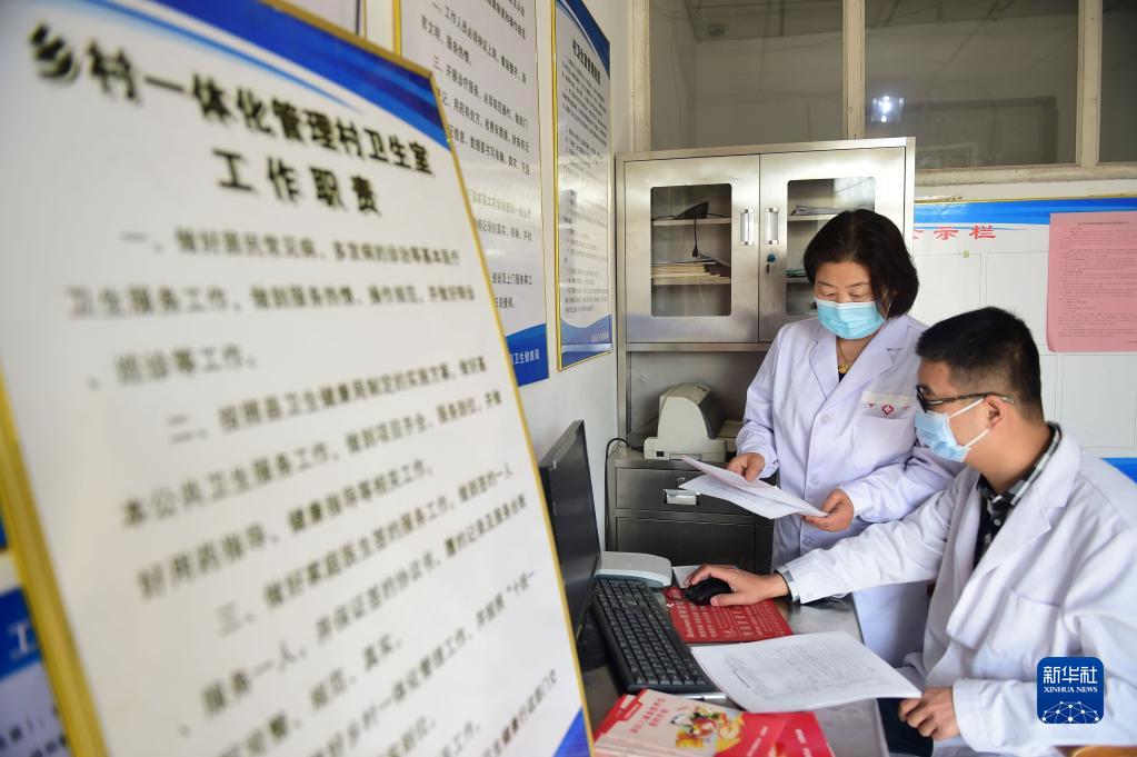 4月1日,鹽山縣孟店鎮東大辛村大學生村醫趙磊(右)在村衛生室整理村民健康檔案。