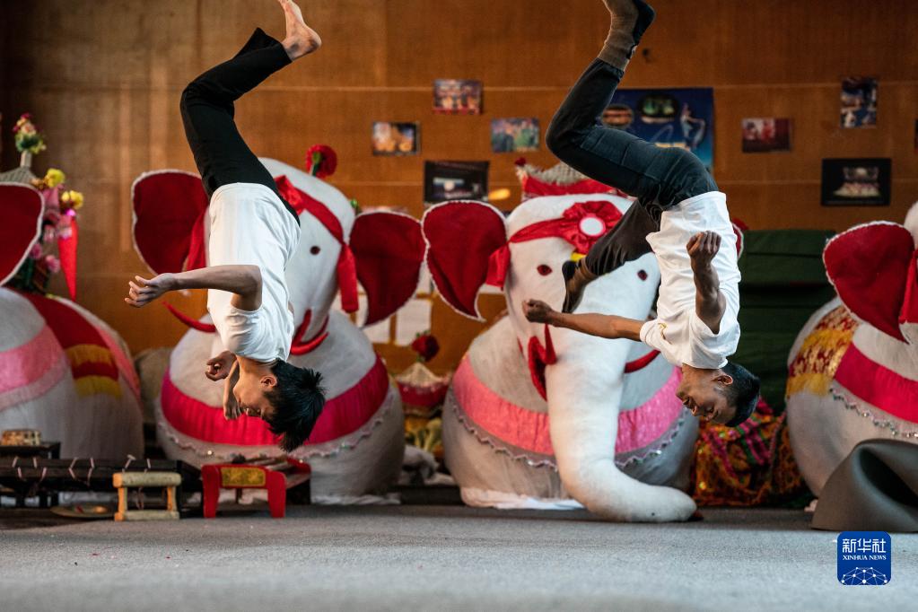耿馬縣民族歌舞團演員巖平(左)、宰努思在練功房練習側空翻(3月23日攝)。
