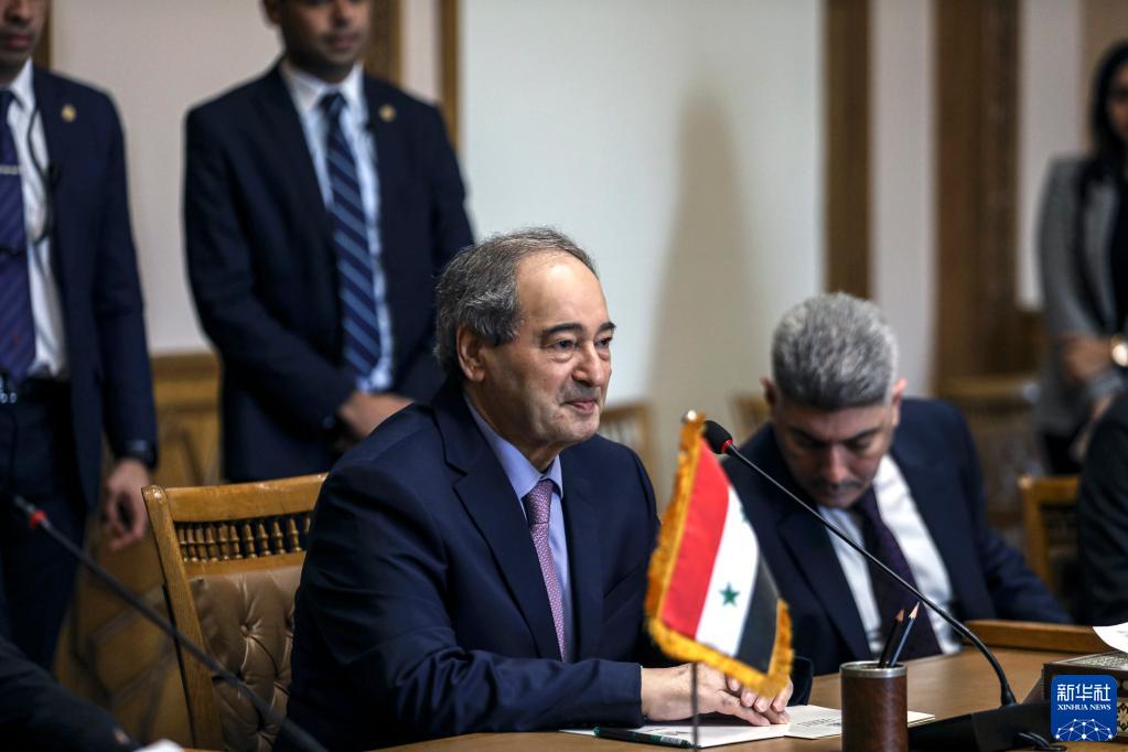 4月1日,在埃及首都開羅,敘利亞外長梅克達德(中)與埃及外長舒凱里(不在畫面中)舉行會談。