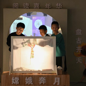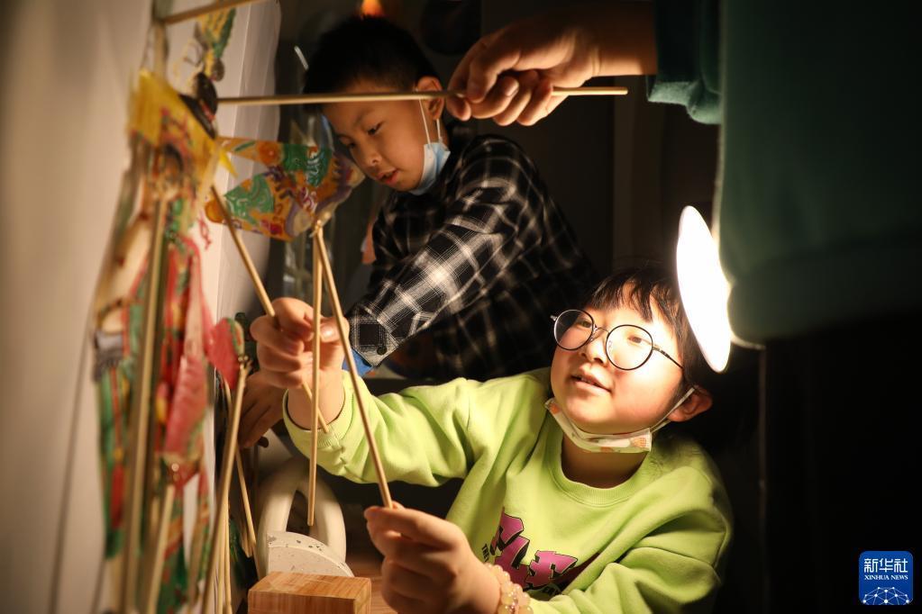 4月1日,在甘肅省蘭州市的讀者出版集團數字閱讀中心讀者小站,小朋友體驗中國神話故事主題皮影戲。