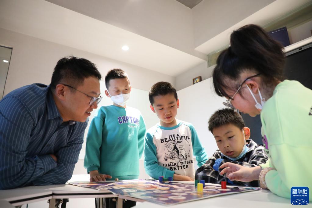4月1日,在甘肅省蘭州市的讀者出版集團數字閱讀中心讀者小站,工作人員與小朋友一起玩“講述中國神話故事”的飛行棋游戲。