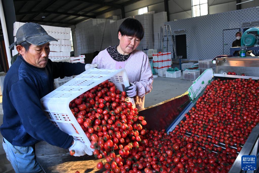 4月1日,在山東省棗莊市臺兒莊區馬蘭屯鎮按揭農業基地,菜農在分選包裝西紅柿。