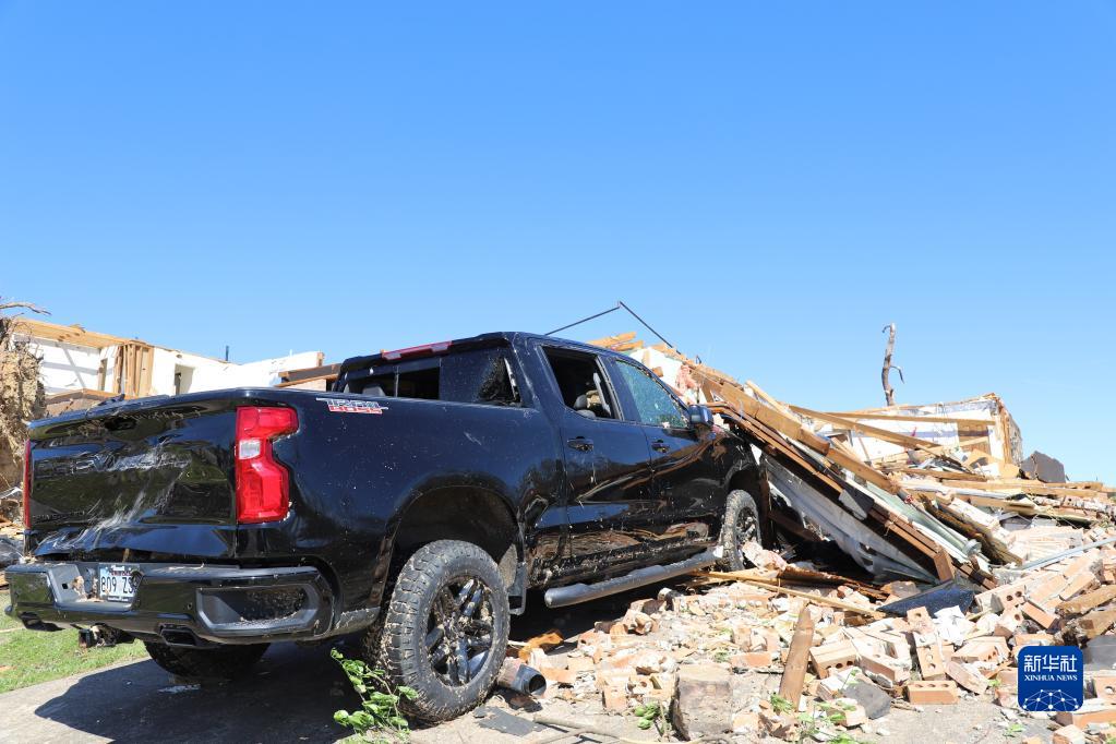 這是4月1日在美國阿肯色州小石城拍攝的一輛受損的汽車。