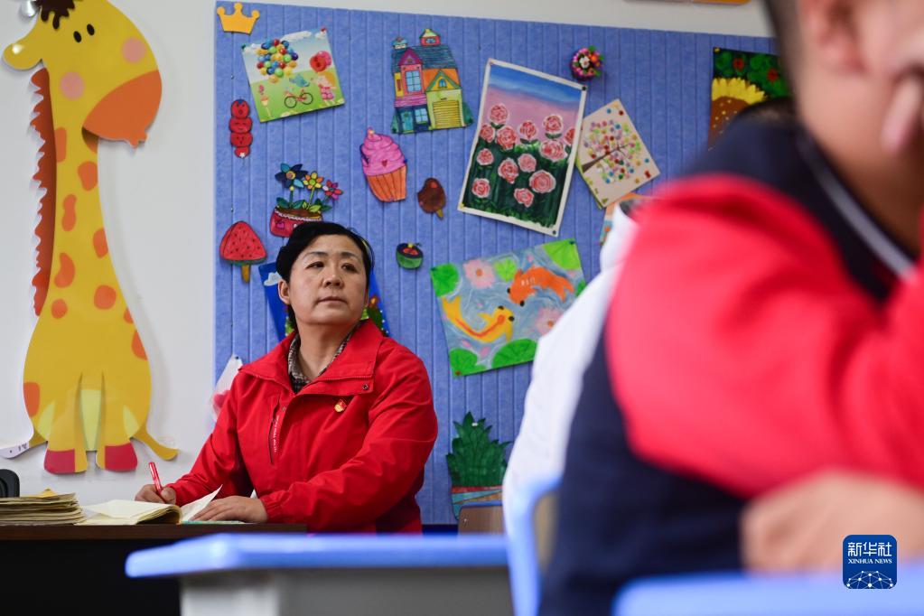 3月30日,在青海省西寧市星光特殊兒童服務中心,陳志芳在批改作業間隙觀察孩子們上課情況。