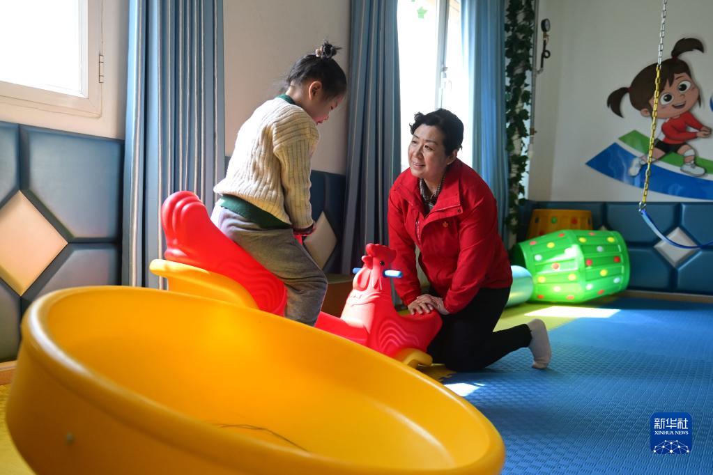 3月30日,在青海省西寧市星光特殊兒童服務中心,陳志芳(右)給孤獨癥兒童做運動訓練。
