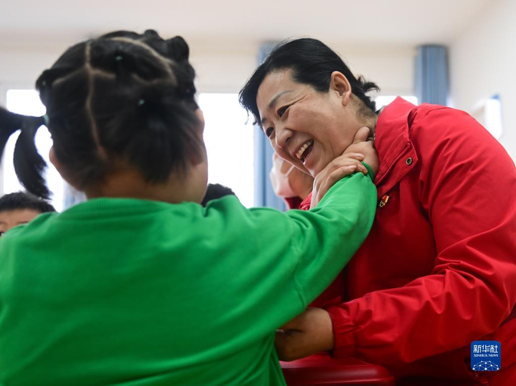 3月30日,在青海省西寧市星光特殊兒童服務中心,陳志芳(右)給一名孤獨癥兒童做康復訓練。