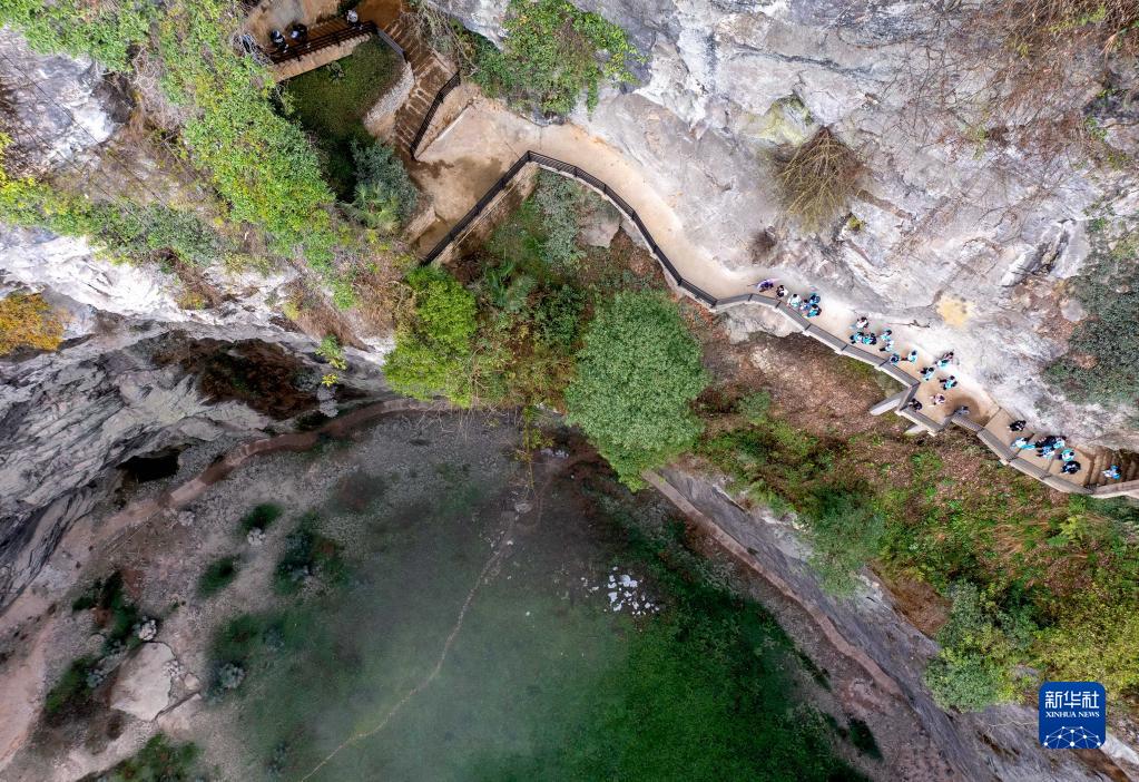 春暖花開時節,在位于湖北省西部山區的宣恩縣矅天眼景區,眾多春季研學的師生在深達290余米的鑼圈巖天坑及周邊溶洞中進行科普學習。