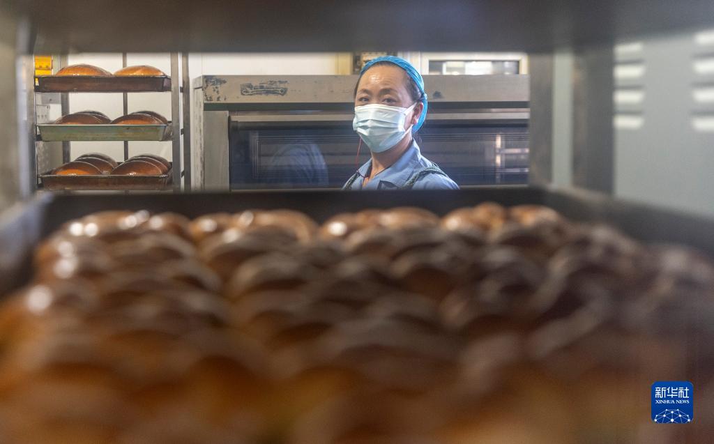 4月1日,在塔城市疆趣食品坊,員工袁月在查看“塔城奶酪包”的烘焙情況。