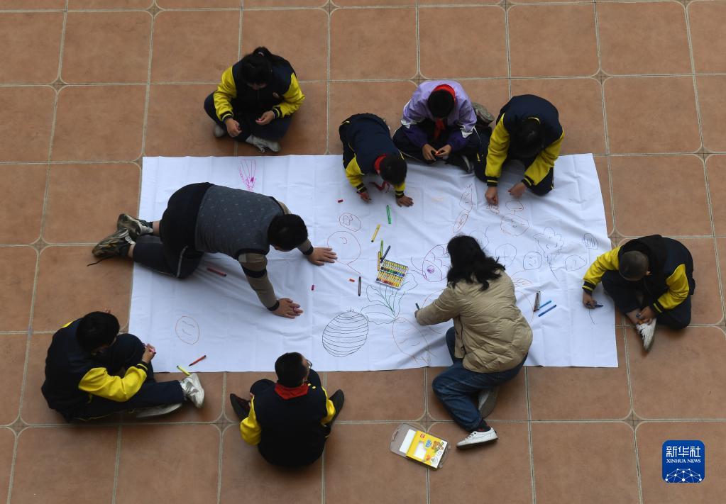 在廣西南寧高新區龍華學校,何冬艷教學生畫畫(3月31日攝)。