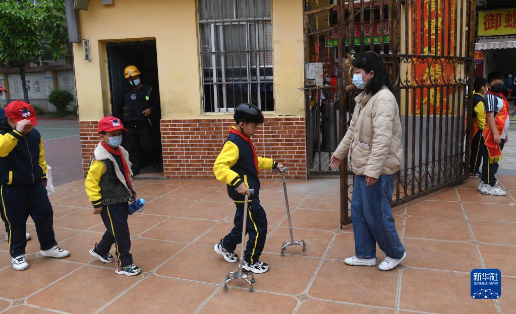 在廣西南寧高新區龍華學校,何冬艷放午學后領著她照顧的學生準備走出校園(3月31日攝)。