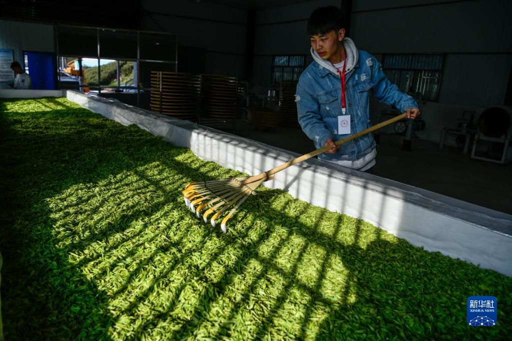 4月2日,工人在貴州省貴陽市神鵲茶場攤晾春茶。