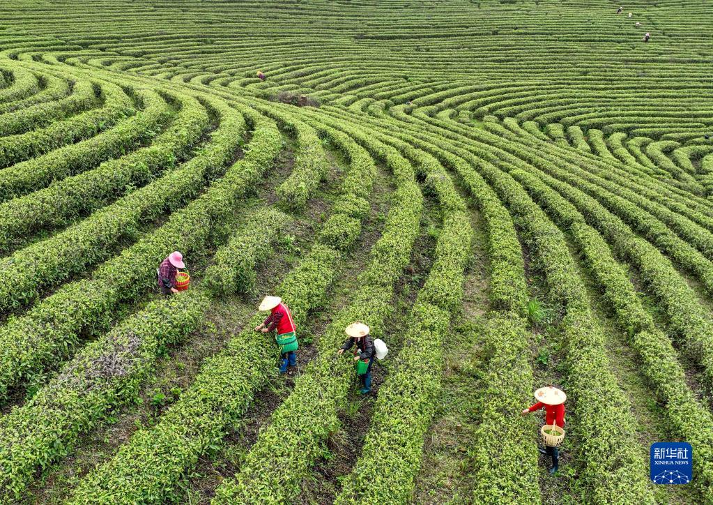 4月2日,采茶工在湖南省永州市江華瑤族自治縣濤圩鎮牛牯嶺生態茶場采摘春茶(無人機照片)。
