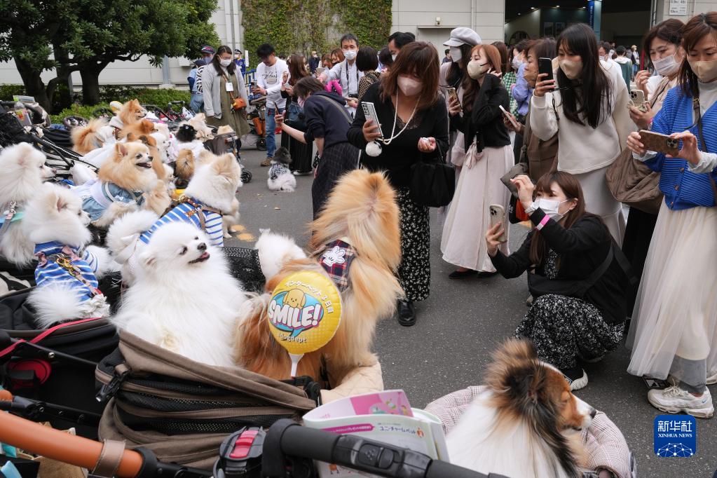 4月2日,人們在日本東京國際寵物用品博覽會上為寵物拍照。
