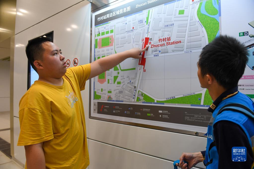 4月2日,到達目的地以后,黃志能(左)告訴爸爸黃少禮應該走哪個出站口。黃志能腦子里就像有一張地鐵圖,兩人一起坐地鐵時基本不用依靠導航。