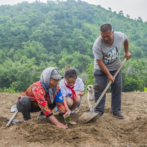 田萬貴、陸敏夫婦和小朋友在遼寧省凌海市翠巖鎮前田屯村“鷺嶺”植樹(2022年6月3日攝)。