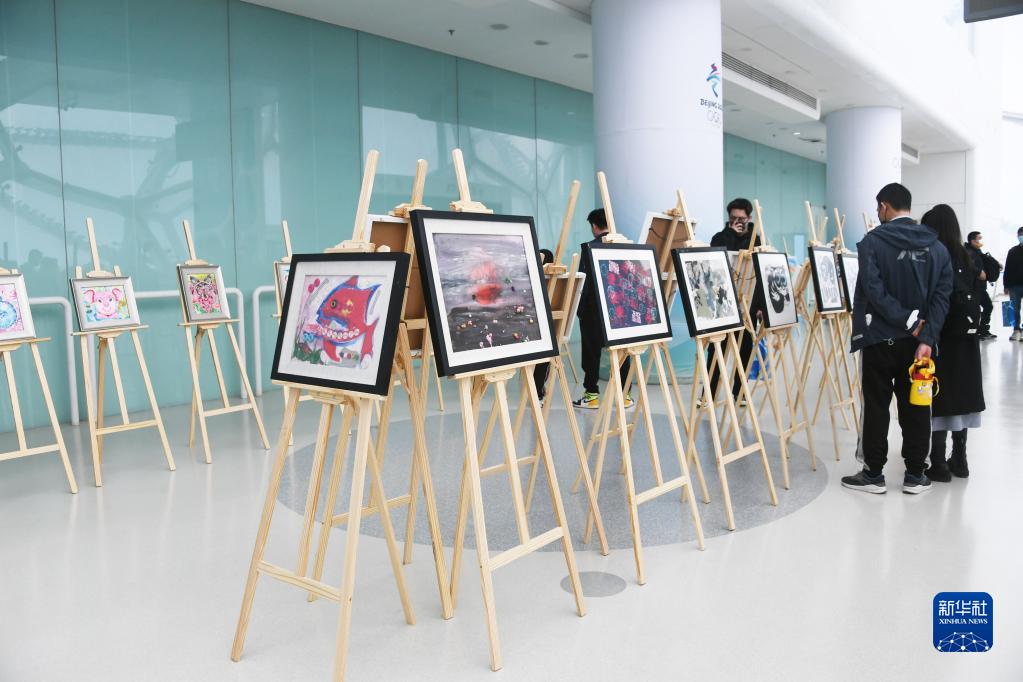 4月2日,市民在國家游泳中心“水立方”參觀融合兒童畫展。