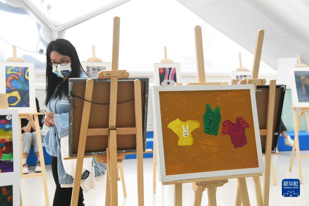 4月2日,市民在國家游泳中心“水立方”參觀融合兒童畫展。