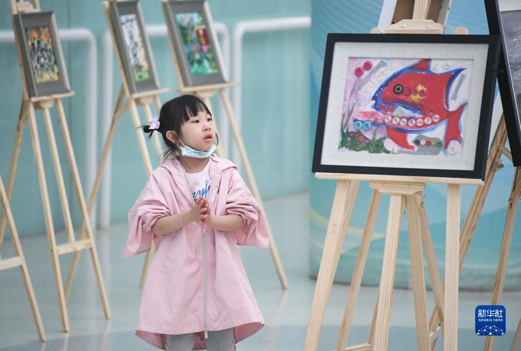 4月2日,一名小朋友在國家游泳中心“水立方”參觀融合兒童畫展。