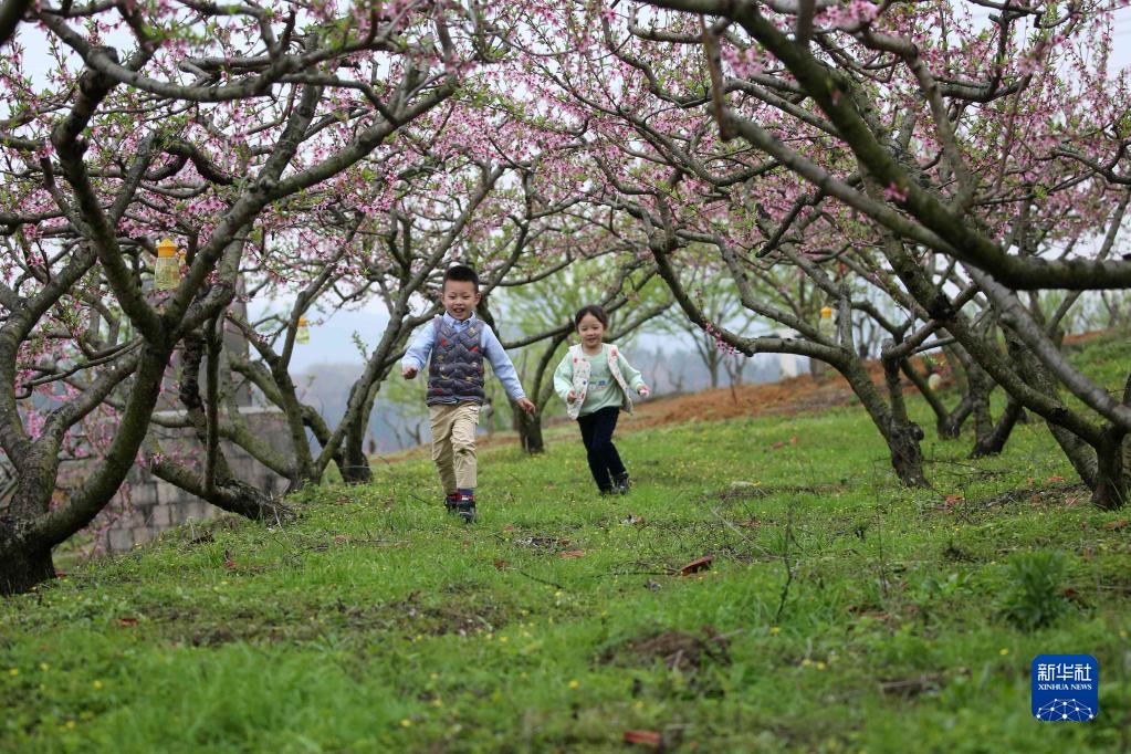 4月2日,在貴州省銅仁市玉屏侗族自治縣皂角坪街道甕陽村,小朋友在花間奔跑。