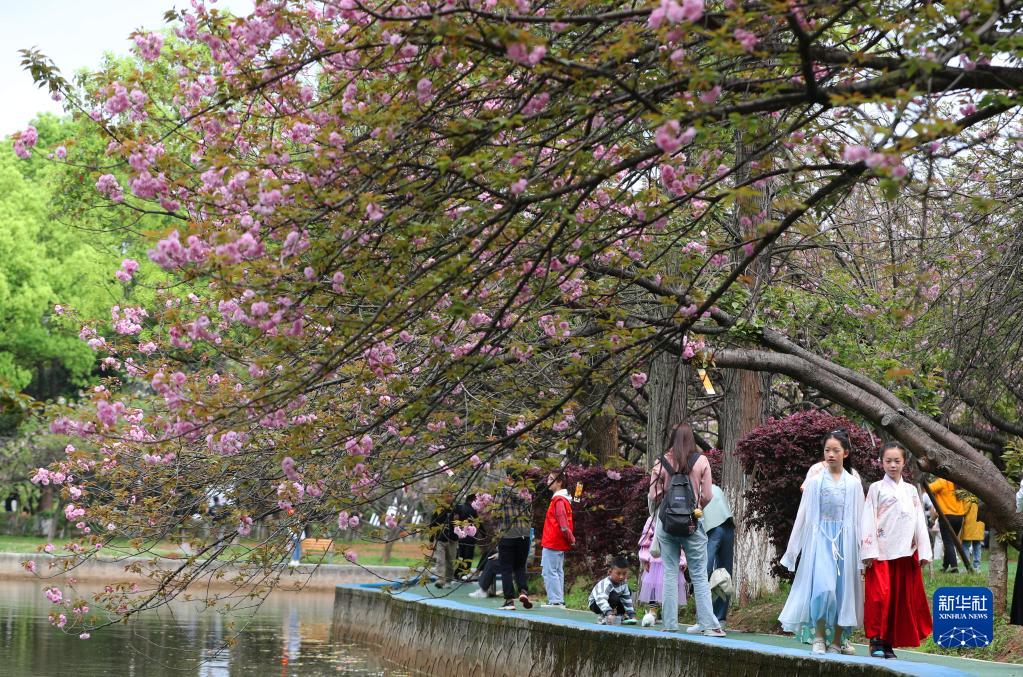 4月2日,在湖南省湘潭市,人們在湖南科技大學櫻花園里游玩賞花。