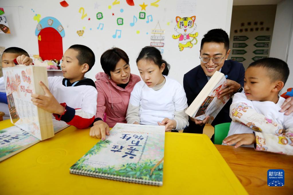 4月2日,在關注“星星的孩子”公益捐助活動上,工作人員為孩子們贈送畫筆和畫本。