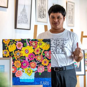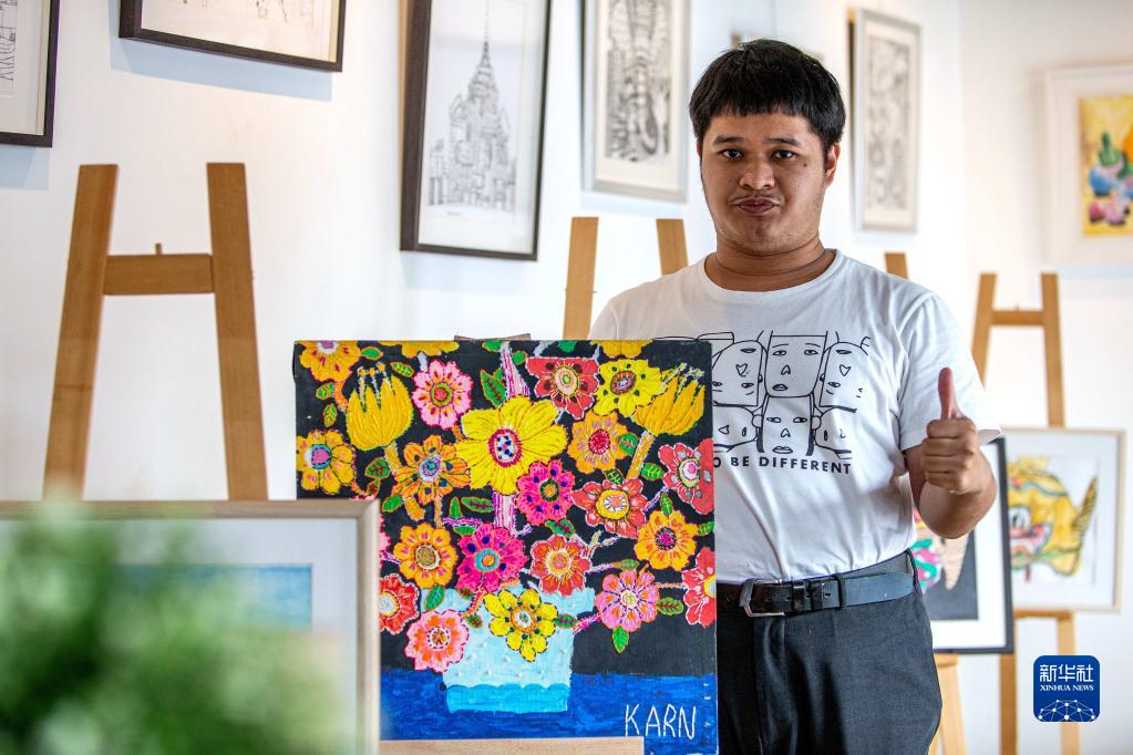 4月2日,在位于曼谷的泰國孤獨癥職業中心,一名孤獨癥患者展示自己的繪畫作品。