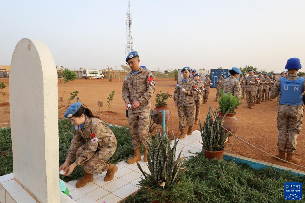 中國第十批赴馬里維和醫療分隊當日在聯合國駐馬里多層面綜合穩定特派團(馬里穩定團)東戰區加奧超營的維和烈士廣場開展清明祭掃活動,悼念藍盔忠魂。
