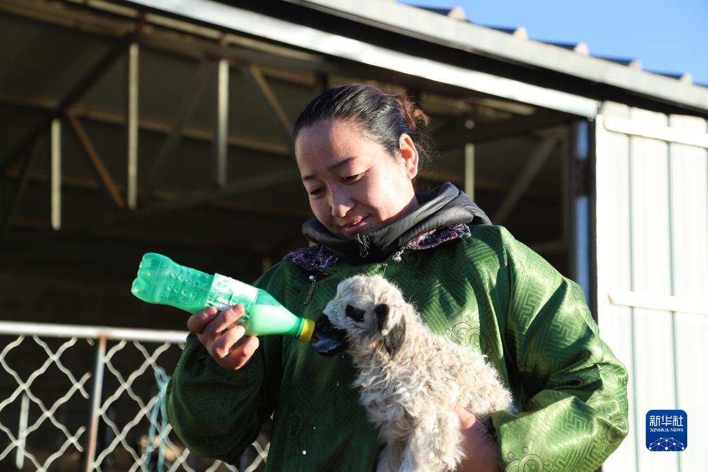 3月29日,朝克德力根的妻子孟根圖雅用瓶子給小羊羔喂奶。
