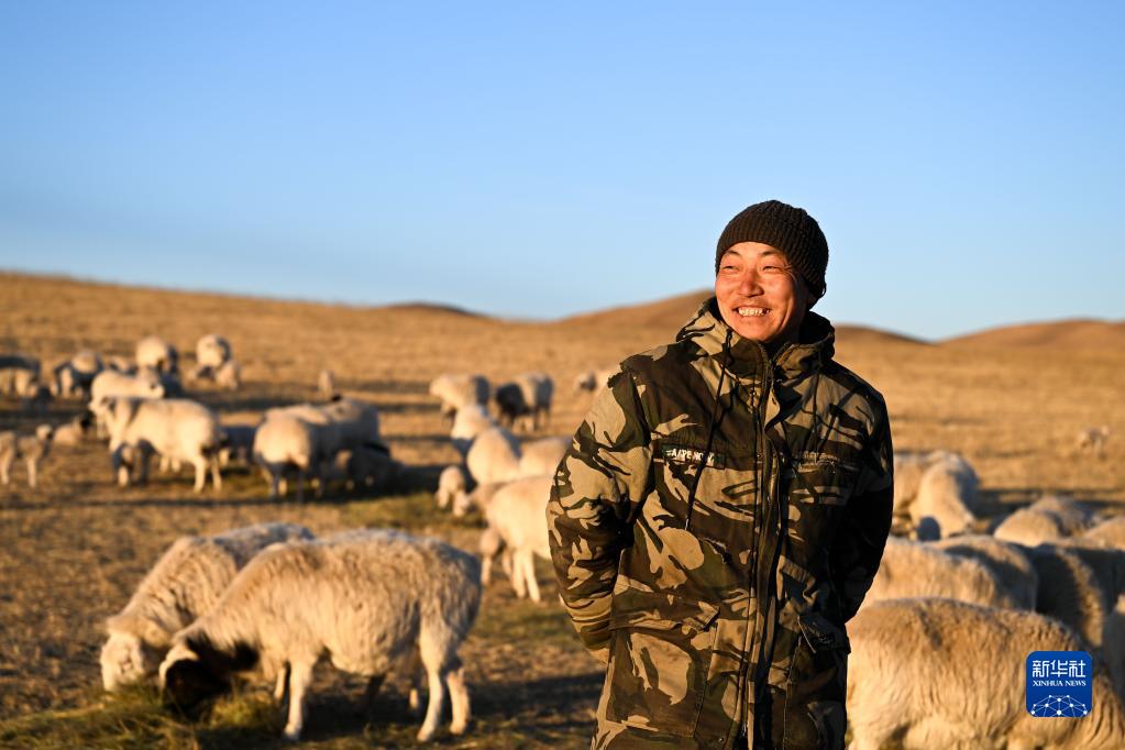 3月29日,朝克德力根站在草場的羊群之中露出笑容。