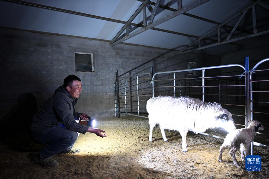 3月28日深夜,朝克德力根來到羊圈中查看母羊和新生羊羔的情況。