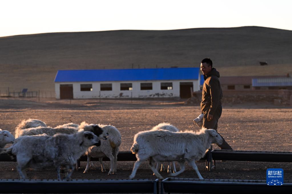 3月28日日落時分,朝克德力根在羊圈投喂飼草料、查看羊群情況。