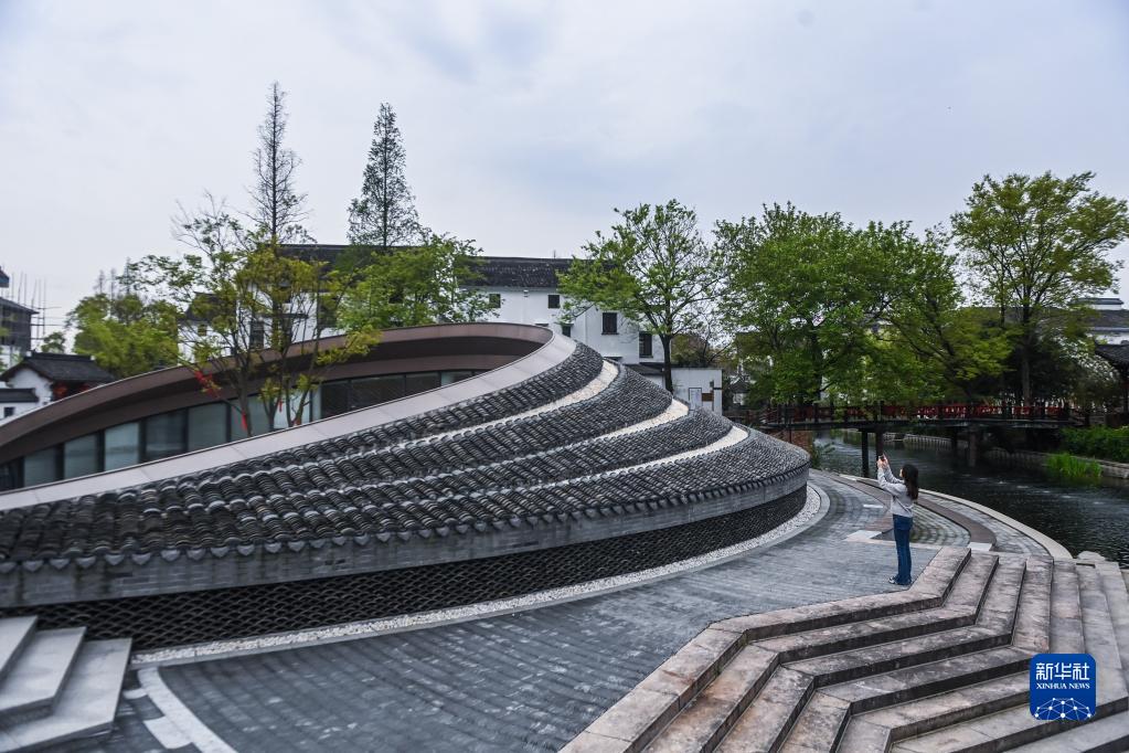 4月3日,游客在嘉興市秀洲區王店鎮鎮中村的未來鄉村展示館外拍照留影。