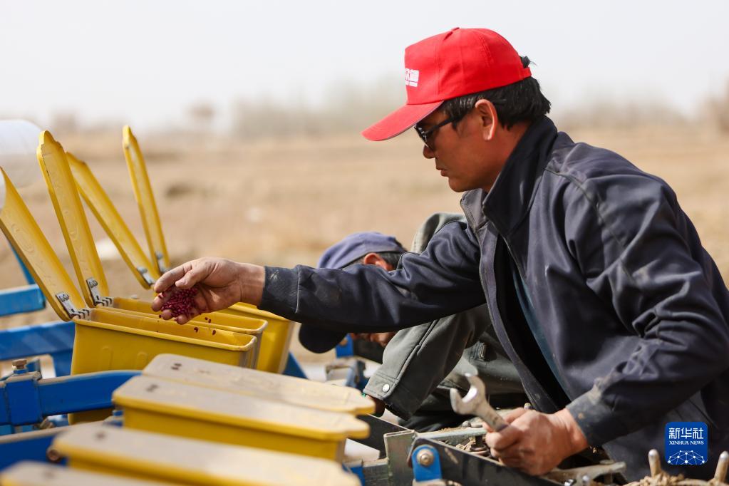 在新疆尉犁縣,棉田管理人員檢查棉花種子(3月30日攝)。