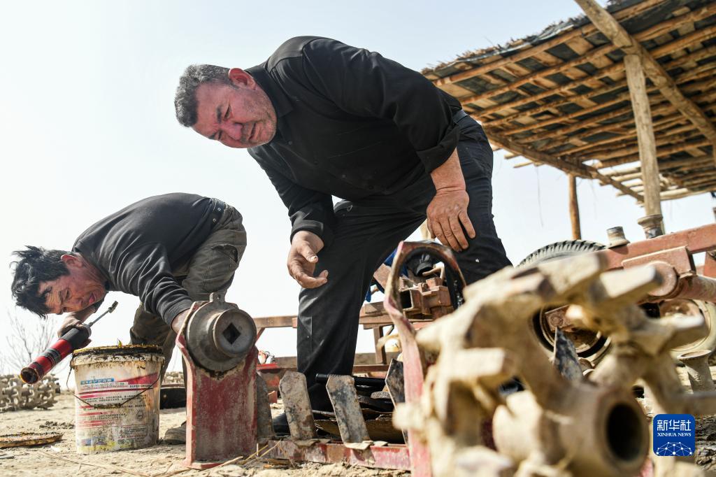 在新疆尉犁縣,棉農爾肯·熱依木(右)檢修農機準備春播(3月29日攝)。