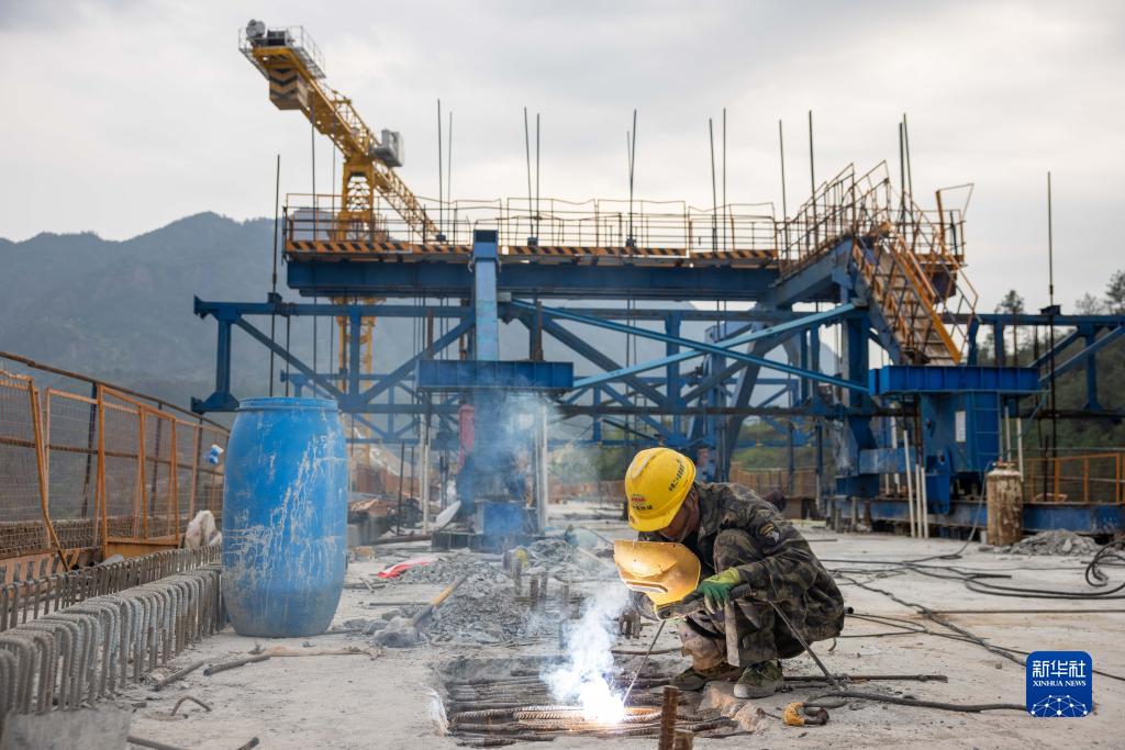 4月3日,中鐵二十四局的工人在杭溫鐵路陡門溪特大橋上施工。陡門溪特大橋連續梁于4月1日凌晨順利合龍。