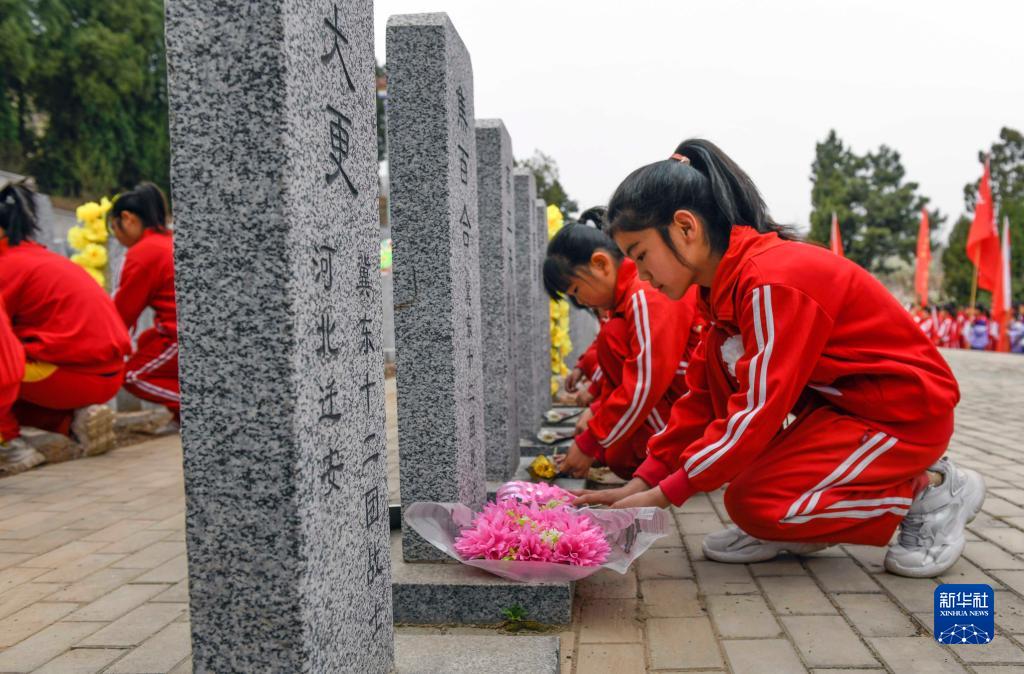 4月3日,學生在河北省遵化市鐵廠鎮甲山烈士陵園獻花。