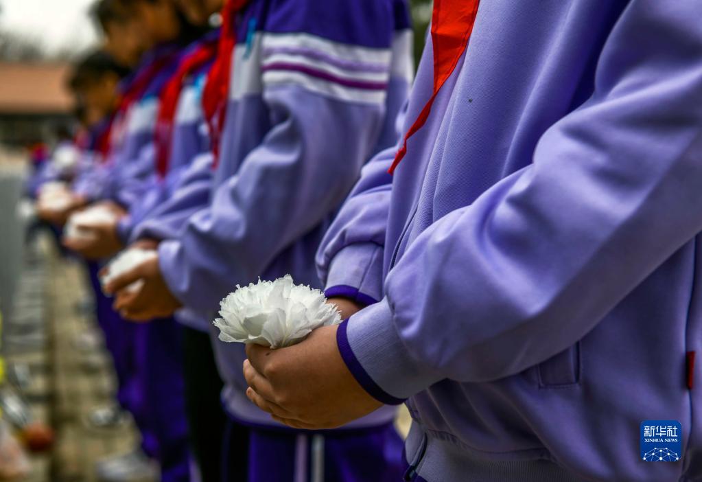4月3日,學生在河北省遵化市鐵廠鎮甲山烈士陵園獻花。