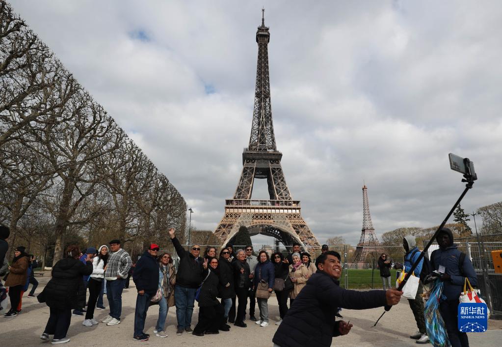 4月3日,游客在法國巴黎埃菲爾鐵塔附近拍照留念。