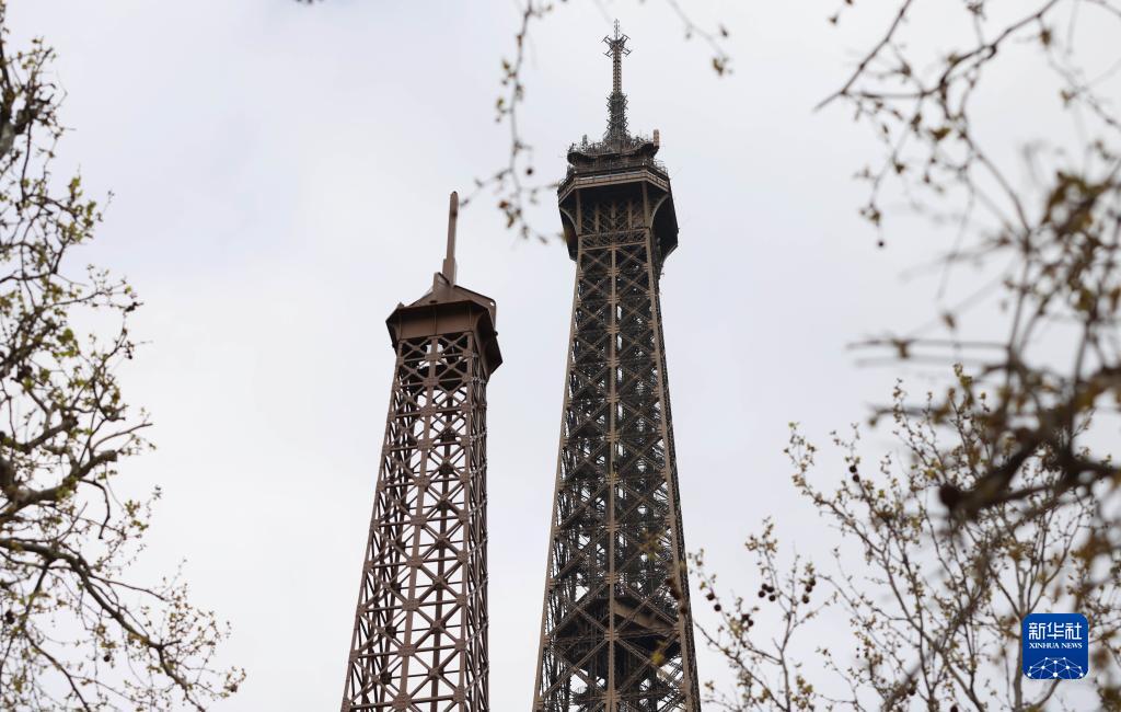 這是4月3日在法國巴黎拍攝的埃菲爾鐵塔(右)和“小埃菲爾鐵塔”。