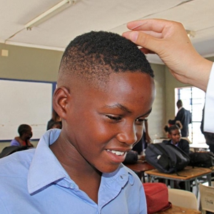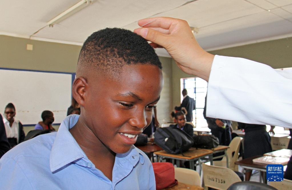 4月3日,在納米比亞溫得和克的伊曼紐爾·謝菲迪中學課堂上,一名學生體驗針灸。