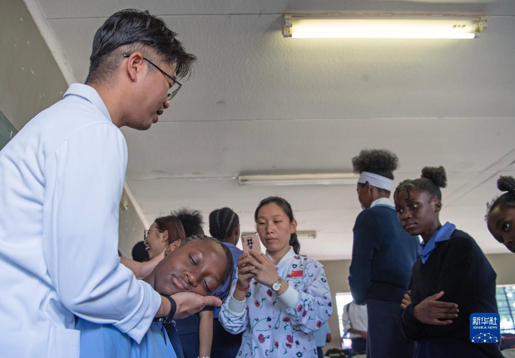 當日,第15批中國援納米比亞醫療隊隊員在伊曼紐爾·謝菲迪中學為50多名學生帶來一堂別開生面的中文課。他們用針灸、火罐作教具,以傳統中醫文化為內容,讓同學們在寓教于樂的沉浸式體驗中學習中文。