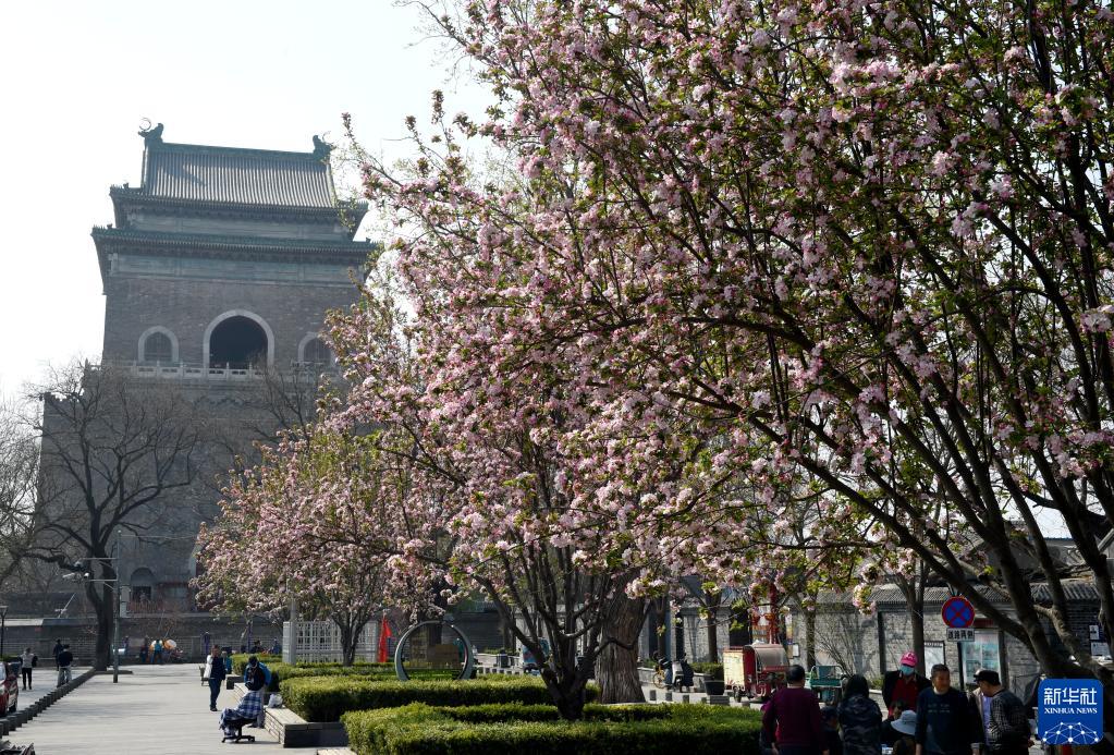 鮮花掩映下的北京鐘樓(3月31日攝)。新華社記者 羅曉光 攝