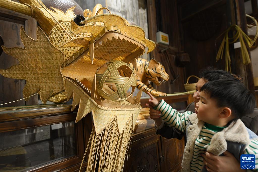 4月3日,村民帶著小孩在姜鵬工作室里串門,孩子被竹編的龍頭吸引。新華社記者 翁忻旸 攝