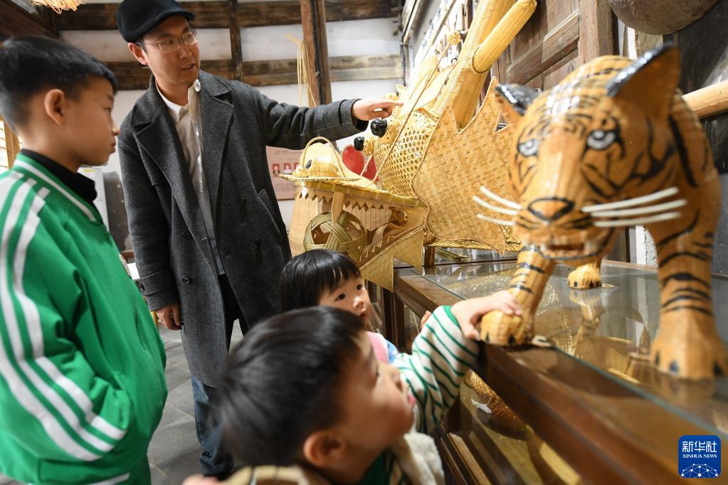 4月3日,姜鵬給前來參觀的兒童介紹竹編龍頭的機關。新華社記者 翁忻旸 攝