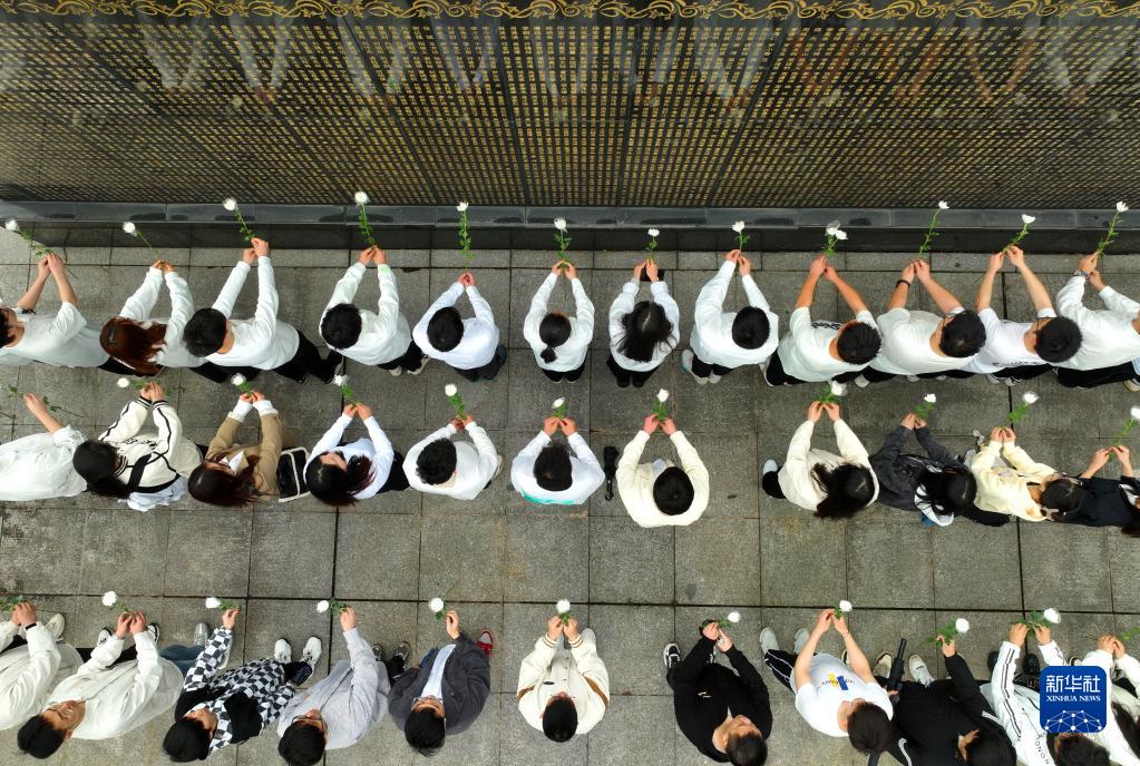4月4日,在湖南省衡陽市烈士陵園,南華大學志愿者在革命烈士紀念碑前默哀(無人機照片)。