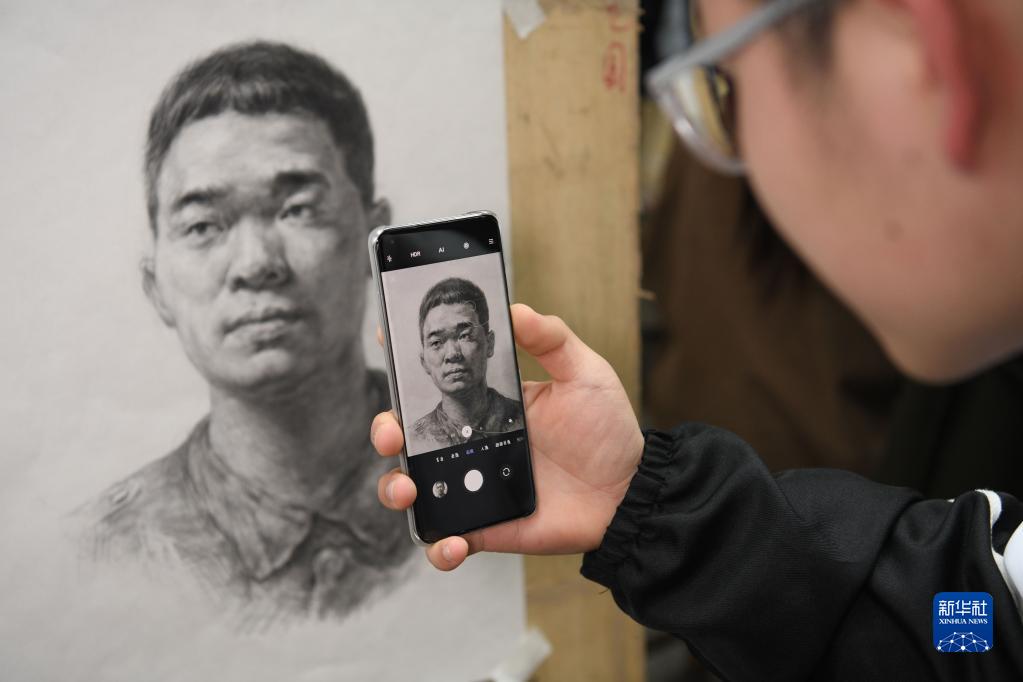 3月31日,安徽師范大學的大學生俞家瑞用手機拍攝自己創作的烈士畫像。