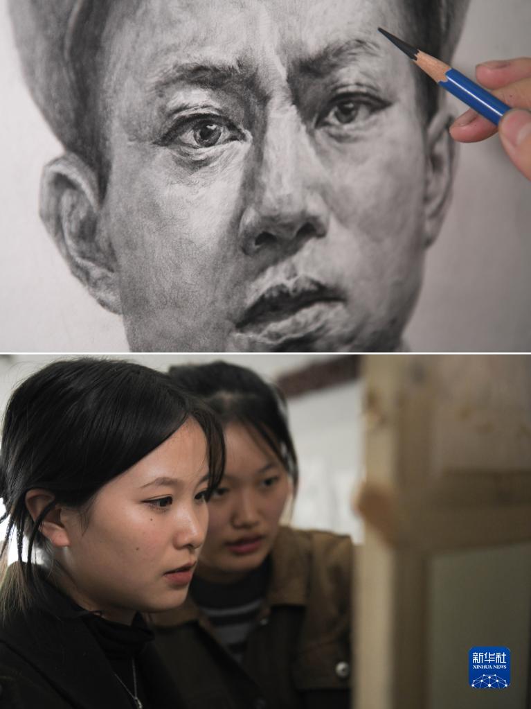 上圖是安徽師范大學的“00后”大學生胡守瑩畫的烈士畫像;下圖為胡守瑩(前)為烈士畫像(拼版照片,3月31日攝)。