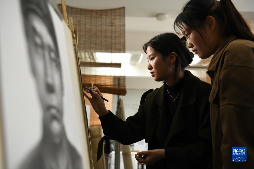 3月31日,在安徽師范大學,“00后”大學生胡守瑩(左)為烈士畫像。