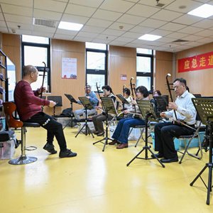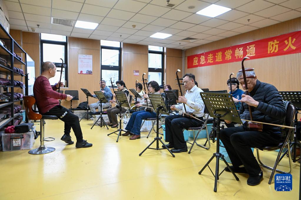 4月4日,在天津市河西區文化館,老人們在老師的指導下學拉二胡。