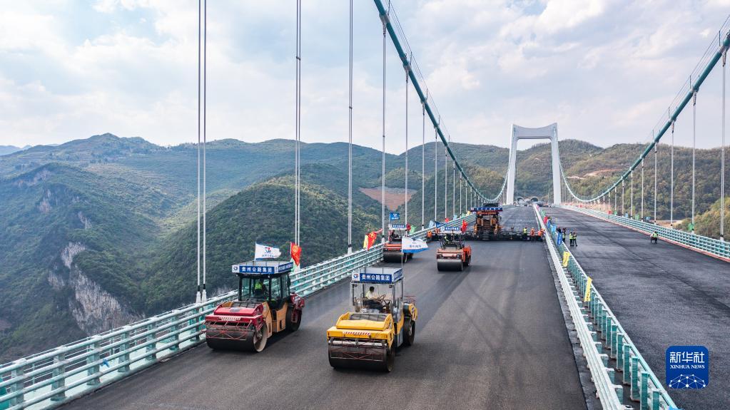 在金烽烏江大橋,貴州公路集團工人駕駛攤鋪機進行橋面鋪裝施工(無人機照片,4月3日攝)。